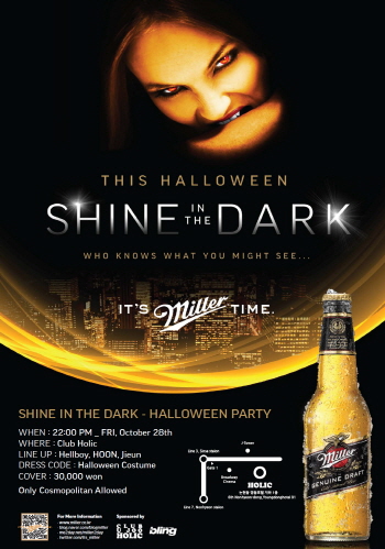 오는 10월28일 금요일 밤에 열릴 할로윈 파티 '샤인 인 더 다크(Shine In The Dark)'는 프리미엄 수입 맥주 브랜드 밀러 제뉴인 드래프트가 전세계적으로 매년 펼치고 있는 할로윈데이 파티다.