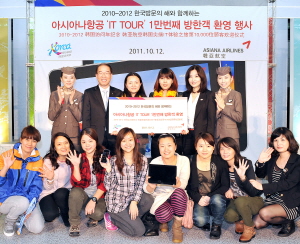 [프라임경제] 아시아나항공(대표 윤영두)은 12일 인천국제공항 1층 입국장에서 IT투어 1 만번째 입국 손님을 축하하는 행사를 가졌다고 밝혔다.