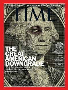 | 금년 8월초 스탠더드앤드푸어스(S&P)가 미국의 국가신용등급(미국 국채 신용등급)을 최고 등급인 AAA에서 한단계 아래인 AA+로 강등, 미국 자존심에 상처를 입혔다. 미국의 시사주간지 ‘타임’은 9월호 표지에 이를 풍자한 그림을 실었다. 미국의 신용등급 하락은 1941년 AAA를 부여 받은지 70년만의 일이었다. | ||