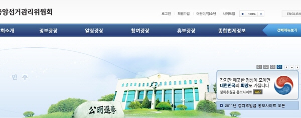 중앙선거관리위원회 메인 홈페이지. 우측 상단을 보면 이벤트와 관련, 대한항공 로고와 유사한 이미지가 노출되고 있음을 알 수 있다.