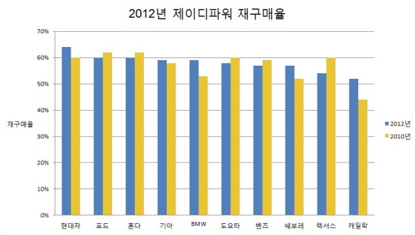 현대차는 일반 및 고급 브랜드 33개사를 대상으로 한 이번 조사에서 재구매율 64%를 기록, 지난 조사의 3위(60%)보다 2계단 상승한 1위에 등극하며 미국시장에서 고객 충성도가 가장 높은 브랜드로 인정받았다. 기아차 역시 59%의 재구매율을 기록하며 ‘2010 브랜드 재구매율 조사’에서 기록한 7위(58%) 대비 3계단 상승한 4위로 최상위권에 올라섰다.