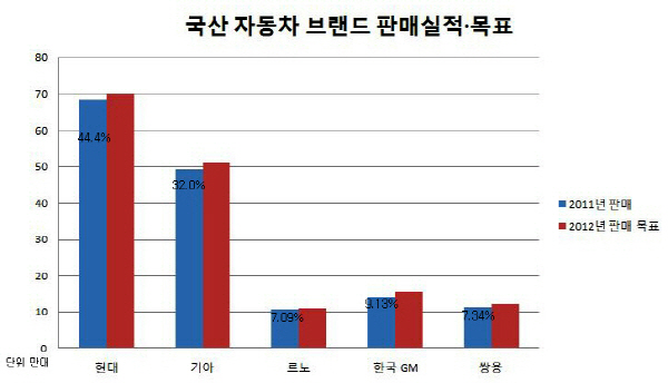 우선 13일 ‘상반기 판매촉진대회’를 개최한 현대자동차(005380)는 올 한해 국내에서 70만대를 판매, 시장점유율 45%를 목표로 하고 있다. 이 수치는 지난해 결산 수치(68만4157대)보다 늘어난 반면 점유율(2011년 46.4%)은 소폭 줄였다. 올해 내수 시장의 판매 환경이 불확실한 만큼 보수적인 전략으로 위기를 타개하겠다는 의지가 담겨 있다.