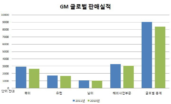 | GM은 지난 2011년 글로벌 시장에서 전년대비 7.6% 신장한 총 902만5942대를 판매해 900만대를 돌파했다. | ||