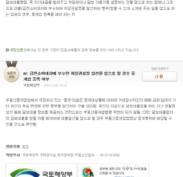 이에 관련해서는 금전소비대차에 부수한 저당권 설정 알선을 업으로 하는 경우, 부동산중개업자로서 등록을 해야 하는지에 대해 관련 정부부처에서 해석을 한 바가 있다. 유력한 포털사이트를 통해 답변이 제공, 부처 해석이 공개된 만큼, ‘유권해석’으로 못 볼 바 아니다.