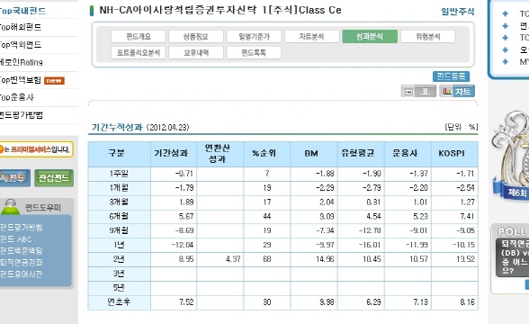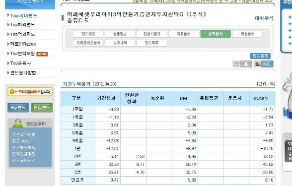 그런데 펀드전문평가업체 제로인-펀드닥터를 통해 자료를 취합해 종합해 본 결과, 이들 상품들은 큰 메리트가 없는 사양길 펀드가 아니냐는 의혹에서 자유로울 수 없는 상품들을 모둠에 불과한 것으로 나타났다.