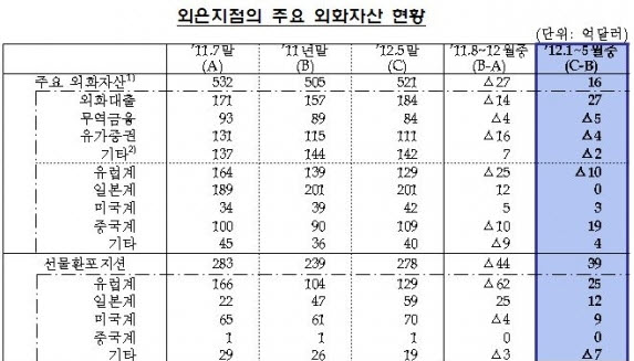 하지만, 실상 내막은 일정한 추가 유입이 유럽계 자금의 감소를 메워줘 전체적으로 사정이 나쁘지 않은 형국이다. 지역별로는 미국계(31억달러) 및 아시아계(중국계 21억달러, 일본계 10억달러) 외은지점이 외화차입금 증가를 주도했으며 지난해(’11.8~12월중) 차입금을 크게 줄였던(93억달러 감소) 유럽계 외은지점도 올해 들어 다시 차입금을 약간 늘린 모습(5억달러)이다. 외은지점의 자산운용 규모도 올해 들어 다시 증가하고 있으며 외화대출은 올해 1월 이후 증가세로 전환(27억달러)됐으며 선물환·스왑시장에서의 외화공급도 증가(39억달러)했다.