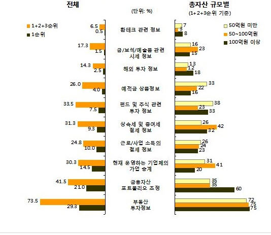 한국의 부자들의 앞으로 유망한 투자 대상 1순위로도 국내부동산(30%)을 꼽아 국내주식(19.8%), 예적금(12.3%)에 비해 높은 선호도를 보이고 있다.