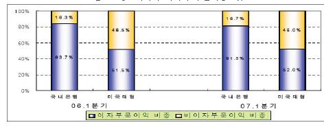 | 한국과 미국 은행간 비이자수익과 이자수익의 비율 비교표. 출처: 새마을금고 비이자수익 확대방안에 관한 연구(방인무, 2011). | ||