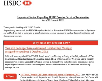 | HSBC가 일본 내 고객들에게 HSBC프리미어 서비스 중단을 공지하고 있다. | ||
