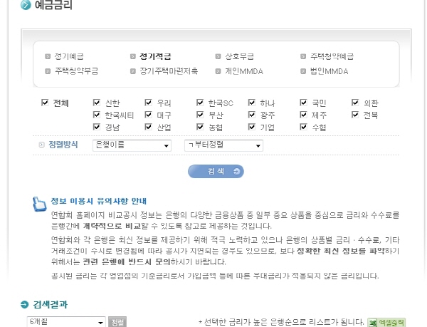 은행연합회에서는 여신과 수신 모두 기본적인 금리 조건을 찾아볼 수 있다. 정기예·적금의 경우 관심있는 은행만 모아서 자료를 뽑아볼 수 있고, 개월수 조건을 통일한 다음에 은행마다 내놓은 상품을 금리순서에 따라 순위별로 정렬해 볼 수도 있다.