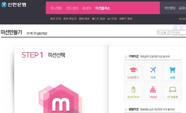 | 신한은행의 미션플러스적금 관련 화면. 미션의 종류도 다양하다. | ||