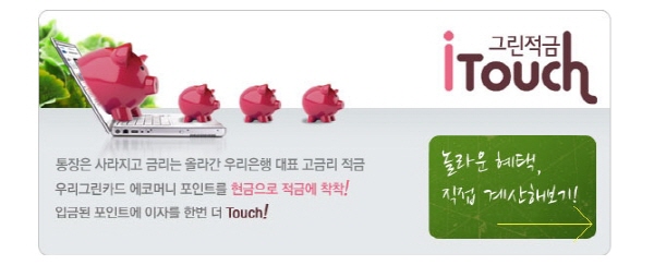 우리은행의 iTouch그린적금은 우리그린신용카드 사용액 및 환경부 등에서 에너지 절감 시 제공하는 에코머니포인트를 적금에 입금할 수 있게 한다. 이렇게 상품을 설계하면 포인트에도 이자가 쌓이도록 금리혜택을 제공할 수 있고 고객들은 녹색생활 실천을 통해 고금리 혜택도 누릴 수 있다는 일석이조 효과가 있다.