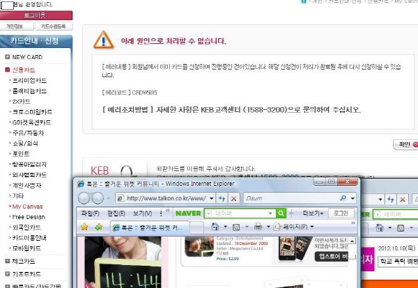 외환카드 홈페이지를 통해 카드 가입을 진행하던 중 에러가 발생한 사례다.