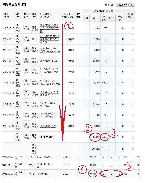 사진에서 원금+할인혜택금액을 모두 더 하게 되면(10월말까지의 우리사랑나누미카드 3635 국내 결제액) 즉, ②+③+④+⑤의 셈을 하면 사용금액이 나와야 한다. 다른 방식으로는 ①의 화살표 방향으로 순차적으로 더해 나가도(위의 상자에서 21일까지의 사용액+아래 상자에 따로 떨어져 있는 29일 1만원)같은 값이 나와야 한다고 할 수 있다.
