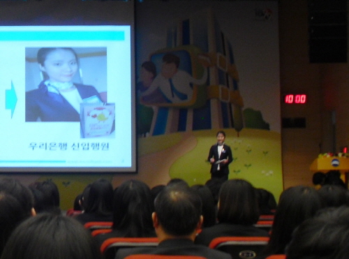 | "우리은행 공략, 특별한 비법은?" 이다희 우리은행 신금호지점 주임이 특성화고 학생들 앞에서 선배로서의 노하우 전수 프리젠테이션을 진행하러 나서 호응을 얻었다. = 임혜현 기자 | ||