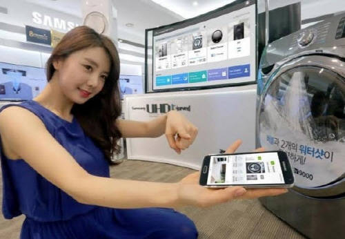 스마트폰으로 가전 제품들을 구동하는 모습. 일명 스마트홈이 IT기업들의 각축장이 될 것으로 보이는 가운데 삼성의 사물인터넷 관련 투자 열의가 빛을 발할지 주목된다. ⓒ 삼성전자