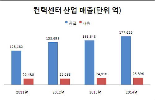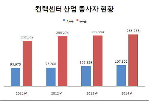 컨택센터 산업총람을 보면 운영, 구축, 파견, 사용분야의 2011년 산업 종사자는 32만6179명이었으나 2014년은 37만4138명으로 14.7%(4만7959명) 늘었다.