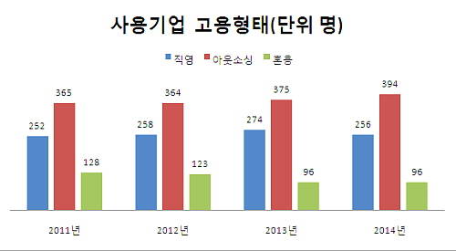 지난해 사용업체 근무자 고용형태 역시 2011년과 큰 차이가 없었다. 2014년 직접고용한 곳은 256개, 아웃소싱 394개, 혼용형태는 96개사였다.