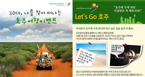 현재 퀴즈이벤트는 3700명이 넘는 많은 젊은이들이 응모할 만큼 큰 호응을 얻고 있다. 또한 호주 왕복항공권이라는 달콤한 상품이 유혹하는 'Let’s go 호주!' 공모전은 '내가 호주에 가게 된다면 하고 싶은 일'을 호주 사진과 함께 적어 응모하는 공모전으로, 호주의 구석구석을 찾아보며 설레는 여행을 계획해 볼 수 있다.
