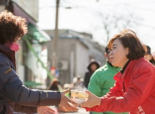 김정재 전 새누리당 부대변인이 포항 표밭을 누비며 떡국나눔을 진행하는 모습. ⓒ 김정재 예비후보 블로그
