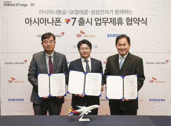아시아나항공 여객마케팅담당 두성국 상무(왼쪽), SK텔레콤 생활가치전략본부장 임봉호 상무(가운데), 삼성전자 한국총괄 B2B 영업팀장 이현식 상무가 '갤럭시 S7-아시아나폰' 프로모션을 위한 업무제휴 협약식 후 기념사진을 촬영하고 있다. ⓒ 아시아나항공