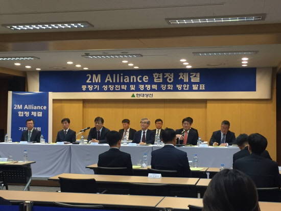 유창근 현대상선 대표이사는 12일 서울 종로구 연지동 현대상선 사옥에서 진행된 '2M 얼라이언스 협정 체결, 중장기 성장전략 및 경쟁력 강화 방안'을 발표하는 자리에서 이같이 밝혔다.