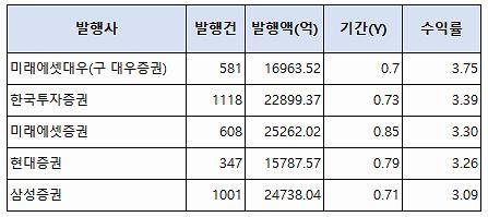 증권사별로는 미래에셋대우가 3.75%로 증권사 중 가장 좋았고 한국투자증권과 삼성증권도 3%대 수익률을 기록하면서 뒤를 이었다.