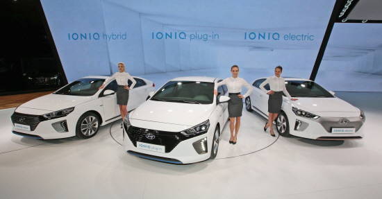 현대차는 '2016 제네바 모터쇼'에서 (왼쪽부터) 아이오닉 하이브리드, 플러그인, 일렉트릭 3종을 선보였다. ⓒ 현대자동차