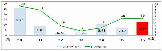 코스피 신규상장 기업수 및 공모금액 추이. ⓒ 한국거래소