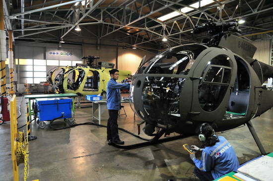 부산 테크센터에서 창정비를 마치고 최종 점검 중인 500MD 헬기. ⓒ 대한항공