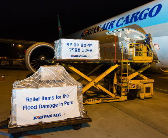 대한항공이 페루의 불쌍한 사람들을 돕기 위해 '도와줄 수 있는 물건들'을 페루의 리마로 출발하는 KE273편 보잉777 항공기에 싣기 위해 기다리고 있어요. ⓒ 대한항공