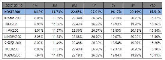 같은 기간 1개월 수익률을 살펴보면 KBStar 200(8.05%), TREX200(8.05%), 파워K200(8.01%), KINDEX200(8.03%), 아리랑 200(8.02%), TIGER200(8.05%), KODEX200(7.94%) 순이었다.