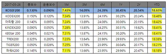 같은 기간 1개월 수익률을 살펴보면 KOSEF200(7.43%), KODEX200(7.34%) KBStar 200(7.31%), KINDEX200(7.28%), TIGER200(7.25%), 아리랑 200(7.24%), TREX200(7.23%), 파워K200(7.11%) 순이었다.