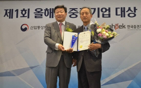 샘표식품이 '제1회 올해의 중견기업 대상'에서 장수기업 부문 대상을 수상했어요. 샘표 오경환 전무(오른쪽)이 상을 받고 난 후에 주형환 산업통상자원부 장관으로부터 축하를 받고 있는 모습이예요. ⓒ 샘표식품