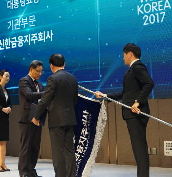 세계기업가정신주간을 맞아 유공자 및 기관에 표창이 진행됐다. 최수규 중소벤처기업부 차관이 대통령표창 기관부문 수상업체인 신한금융지주 사기에 리본 장식을 매주는 모습. ⓒ 프라임경제