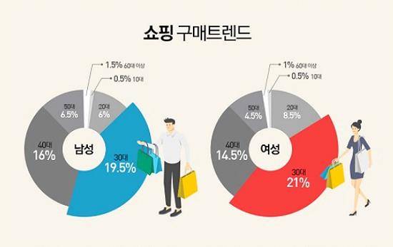 1일 인터파크가 최근 10월부터 11월 둘째 주까지 인터파크 쇼핑에서 물건을 구매한 고객들의 데이터베이스를 분석한 결과, 30대의 비중이 40.5%에 달했다. 연령과 성별을 결합했을 경우, 30대 여성의 비중이 21%로 최다였으며 30대 남성과 40대 남성이 뒤를 이었다.