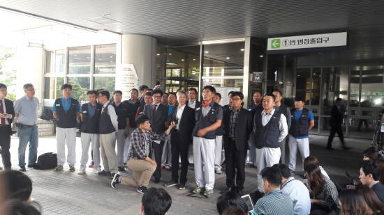 기아차 통상임금 1심 판결 후 입장을 밝히기 위해 모인 노조 관계자들은 상당히 밝은 표정으로 이번 승리를 자축했다. = 전훈식 기자