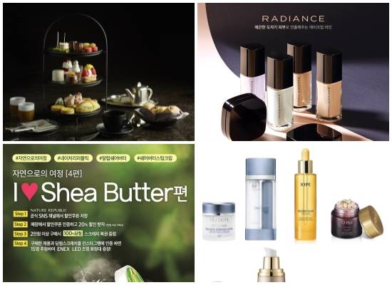 (왼쪽부터 시계방향) 신라호텔 테이스티 윈터 패키지, 에이블씨엔씨 래디언스 3종 8품목 출시, 뉴스킨 '에이지락 트루 페이스' 2종, 네이처리퍼블릭 '알럽쉐어버터' 편 진행. ⓒ 각사