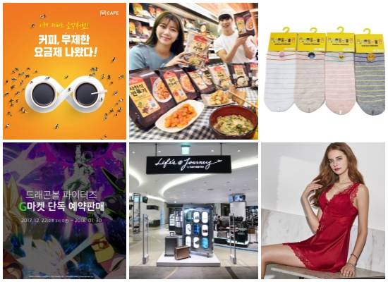 (왼쪽부터 시계방향) 위메프 커피 무제한 패스, 홈플러스 올어바웃푸드 간편식, 롯데마트 보나핏 삭스 오픈, 이랜드 에블린 LOVE ME 라인, 쌤소나이트 디자이너 굿즈 존, G마켓 '드래곤볼 파이터 Z' 예악 판매. ⓒ 각사