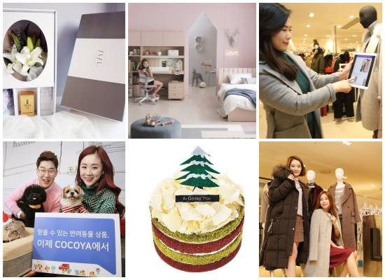 (왼쪽부터 시계방향) 롯데닷컴 크리스마스 올인원 박스 패키지, 현대리바트 루디·그로잉 출시, 롯데백화점 인공지능 챗봇 로사, 현대백화점 이청청 디자이너와 콜라보레이션, AK몰 '라롬드뺑' 크리스마스 케이크 출시, 롯데홈쇼핑 코코야. ⓒ 각사