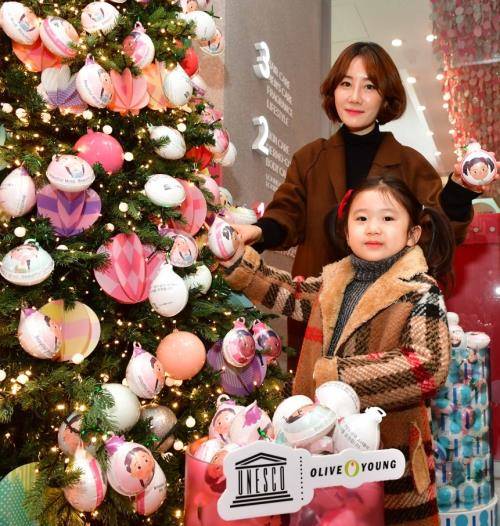 올리브영 강남본점에서 3만 번째 나눔트리 참여 고객이 딸과 함께 소녀교육 캐릭터 장식물을 달고 있다. ⓒ CJ올리브네트웍스