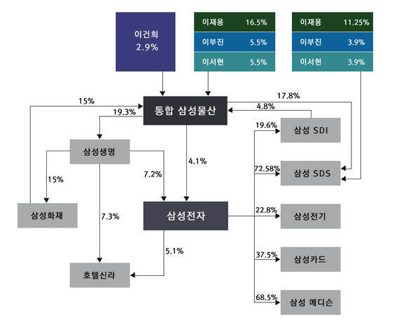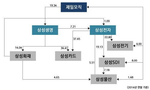 통합 삼성물산 탄생 후의 삼성 계열사들의 위상과 역할 구도. 근래 삼성물산의 전자 지분이 4.63%, 삼성생명의 전자 지분이 8.23%으로 변화한 외에 대강의 구조는 이 틀에서 벗어나지 않는다. 2015년 기준표. ⓒ 프라임경제