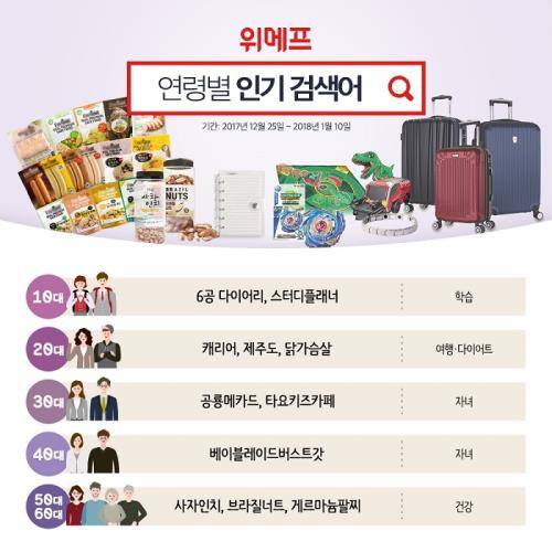 [프라임경제] 위메프(대표 박은상)는 작년 12월25일부터 올해 10일까지 인기 검색어를 분석한 결과 △10대는 학습 △20대는 여행 △3040은 자녀 △5060은 건강 등 연령별로 새해 관심사가 뚜렷하게 나타났다고 17일 밝혔다.