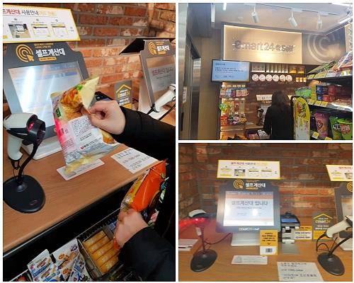먼저 이마트24의 경우 구입할 제품을 선택한 후에는 셀프계산대에서 직접 계산하면 된다. 셀프계산대 모니터에서 일반상품 결제를 선택한 후 바코드 리더기에 제품 바코드를 찍는다. 이후 KT멤버십 할인이나 이마트 포인트 적립을 선택한 후 결제수단을 골라 계산하면 모든 과정이 완료된다.