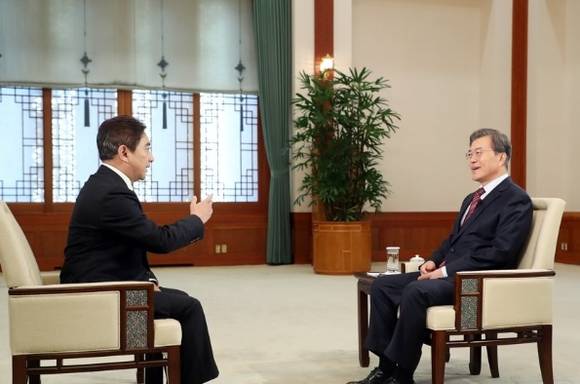 CCTV와 문재인 대통령의 대담 장면. 이 설 메시지는 15일 방송될 예정이다. ⓒ 청와대