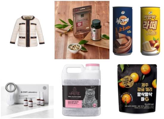 (왼쪽부터 시계방향) 신세계인터내셔날 '브랜드에르노' 초경량 패딩 재킷, 롯데마트 '해빗 건강기능식품' 14종, 세븐일레븐 'PB누가바초코라떼·PB바밤바라떼' 출시, G마켓 말삭말삭하G, 애경 휘슬 고양이 모래 리얼블랙 샌드, LG생활건강 CNP 비타-C 갈바닉 앰플 프로그램. ⓒ 각 사
