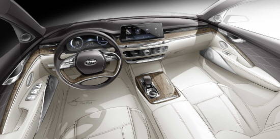 THE K9의 내장은 'Confident Richness: 삶의 영감을 풍성하게 하는 공간'을 디자인 콘셉트로 차량 실내공간과 외부 풍경이 조화를 이루는 감성공간을 구현해냈다. ⓒ 기아자동차