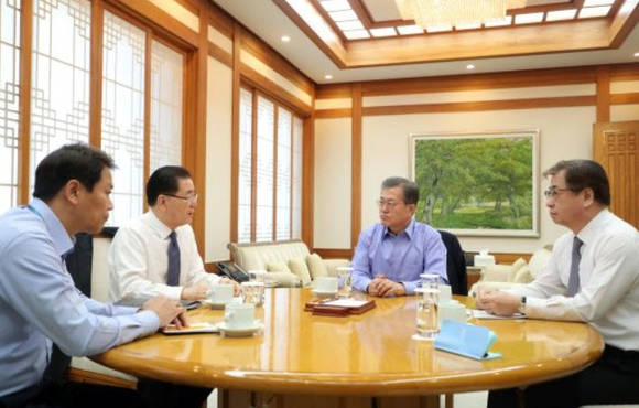 왼쪽부터 임종석 청와대 비서실장, 정의용 안보실장, 문재인 대통령, 서훈 국가정보원장 등이 둘러 앉아 현안을 논의 중이다. ⓒ 청와대