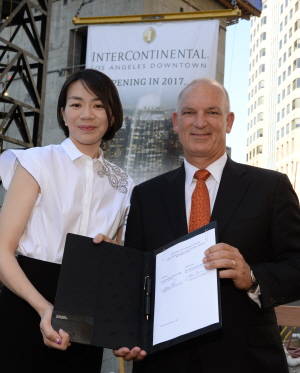 지난 2014년 조현아 전 부사장이 커크 킨셀 인터콘티넨탈호텔그룹 미주지역 대표와 윌셔 그랜드 호텔의 인터콘티넨탈 브랜드 위탁 운영 계약에 대한 서명 후 기념촬영을 하고 있는 모습. ⓒ 대한항공