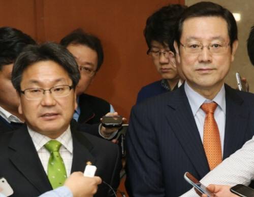 '강기정 대 이용섭' 두 인물의 갈등이 광주시장 선거전을 혼탁하게 만들며 파국으로 치닫고 있다. 사진은 2013년 4월, 당 대표 경선 상황에서 강기정(왼쪽)-이용섭 두 정치인이 나란히 단일화를 통합 협력 방침을 밝히고 함께 취재진의 질문을 받는 모습. ⓒ 뉴스1